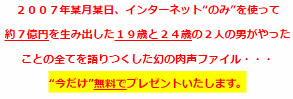 (インターネットを使い、エリートサラリーマンの年収を“毎月”稼ぎ出している若者が今日本では増えているらしい・・・そんな噂を聞いたことがあるかもしれませんが、それは真実です。私自身、2007年は約7億円を生み出しています(その詳細は下に書きました)。その方法の全てを公開していますので、もし興味があれば今すぐにチェックしてみてください。)